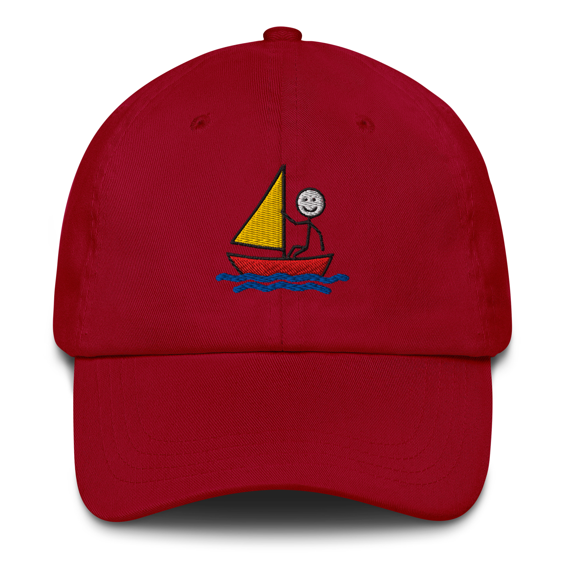 Show your love for the water with this unstructured 6-panel dad hat, crafted from 100% cotton chino twill for a soft, breathable, and comfortable fit. Featuring a minimalist embroidered stickman sailing design, this cap captures the spirit of adventure and relaxation on the water.